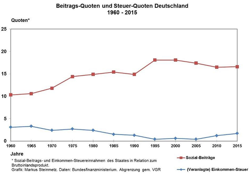 Wenn man sich die Beitrags-Quoten und die Steuer-Quoten der zurückliegenden Jahrzehnte ansieht, dann werden die Einkommensteuer-Änkündigungen der Parlamentsparteien und Merkels „Mitte“-Geschwätz nachgerade zu einer politischen Unverschämtheit. Die veranlagte Einkommensteuer, im Kaiserreich eingeführt, und damals die wichtigste Steuer, ist mittlerweile zu einem Rinnsal verkommen. Dafür sind aber die Sozialbeiträge neben der Mehrwertsteuer** und der Lohnsteuer zur wichtigsten Staatseinnahmenquelle geworden.